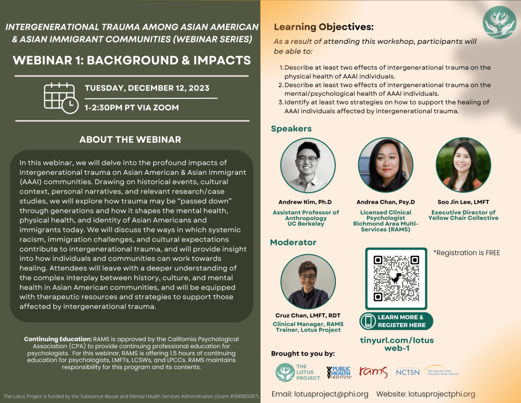 In this webinar, we will delve into the profound impacts of intergenerational trauma on Asian American & Asian immigrant (AAAI) communities. Drawing on historical events, cultural context, personal narratives, and relevant research/case studies, we will explore how trauma may be “passed down” through generations and how it shapes the mental health, physical health, and identity of Asian Americans and immigrants today. We will discuss the ways in which systemic racism, immigration challenges, and cultural expectations contribute to intergenerational trauma, and will provide insight into how individuals and communities can work towards healing. Attendees will leave with a deeper understanding of the complex interplay between history, culture, and mental health in Asian American communities, and will be equipped with therapeutic resources and strategies to support those affected by intergenerational trauma.