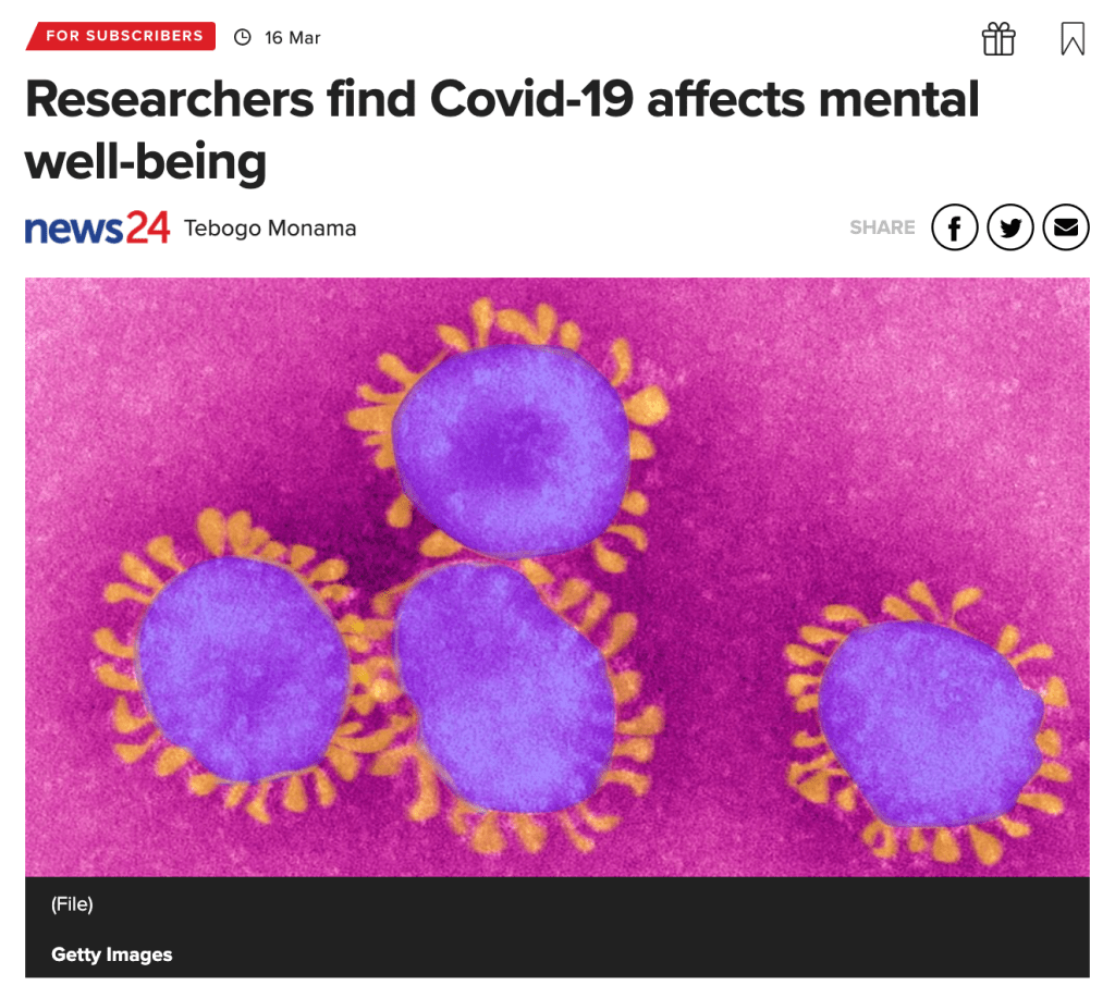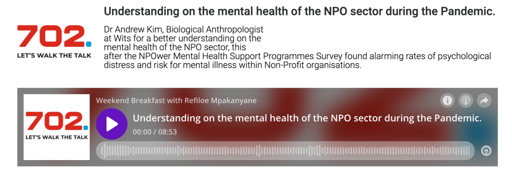 Radio interview on the psychosocial and capacity needs of the NGO sector during COVID-19 in South AfricaTV Interview with Newzroom Afrika on COVID-19 and mental healthRethinking mental healthcare delivery during COVID-19 in South AfricaRadio interview on our Psychological Medicine piece on 702 – Afternoon Drive with Joanne JosephPress release from Cambridge University Press published in News24